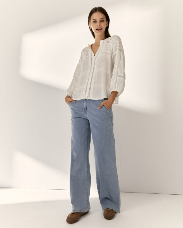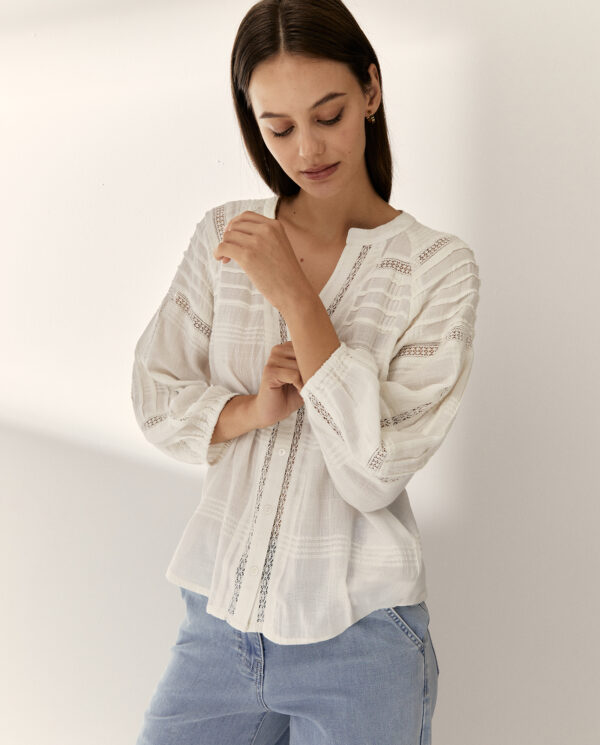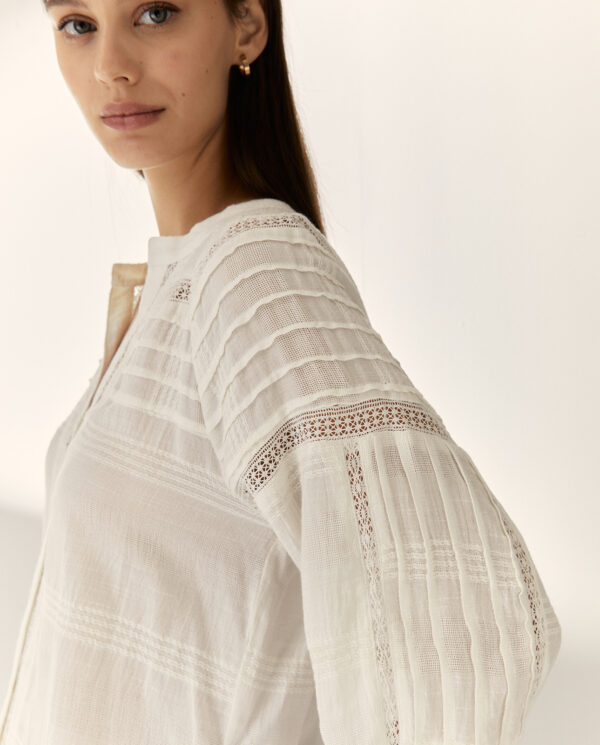 Blusa de cuello mao despuntado, y estilo romántica, de Paz Torras. Con manga francesa abullonada en puño y pliegues en la espalda. Con adorno de pasamanería calada.