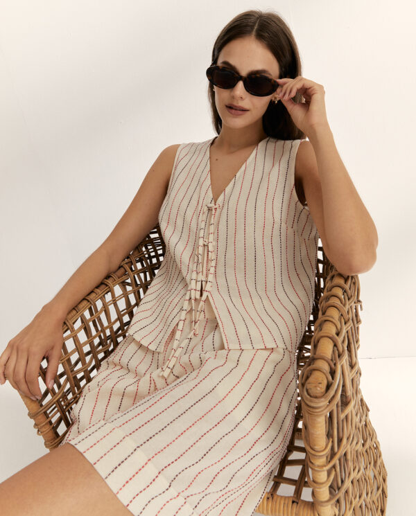 Blusa sin manga, de efecto chaleco de Paz Torras. Estampada en raya diplomática.