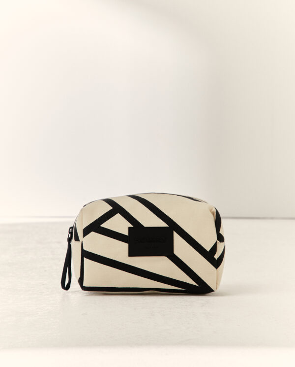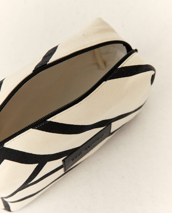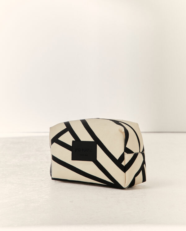 Bolso de mano-neceser, de algodón estampado con motivos geométricos, en color crudo y negro, de Paz Torras.