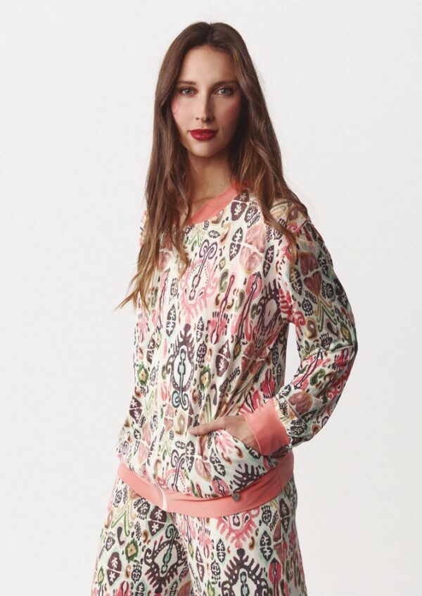 Chaqueta tipo bomber, estampada con motivos étnicos, de la marca Quelbe. Tira al contraste en puños, bajo y cuello. Cremallera delantera.