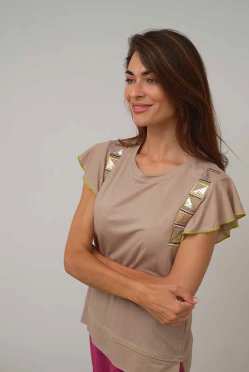 Camiseta de cuello redondo y manga corta con volantes, de la marca Scorzzo. De color liso, con tira bordada en delantero. Bajo con abertura lateral.