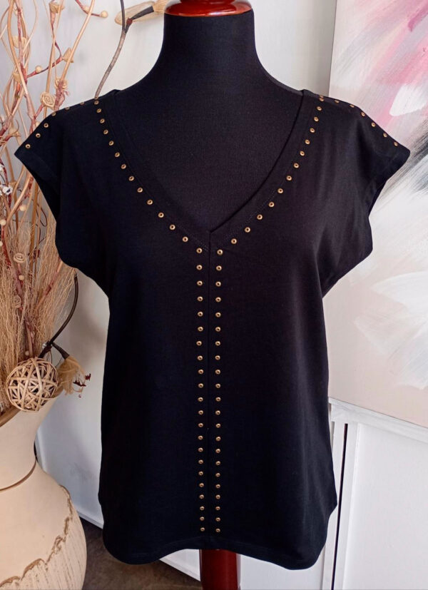Camiseta de amplio escote a pico y manga corta caída. Con adorno de tachuelas en escote, delantero y mangas.