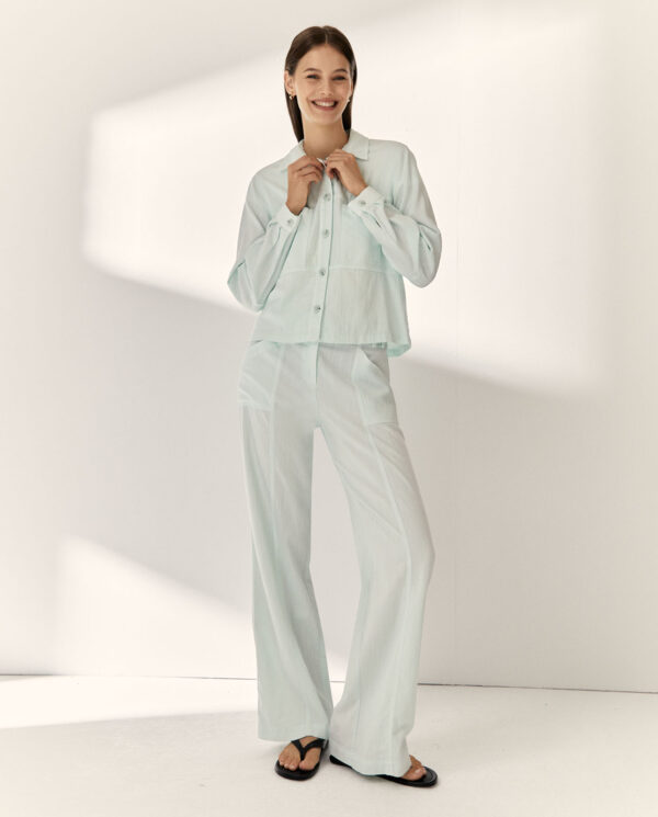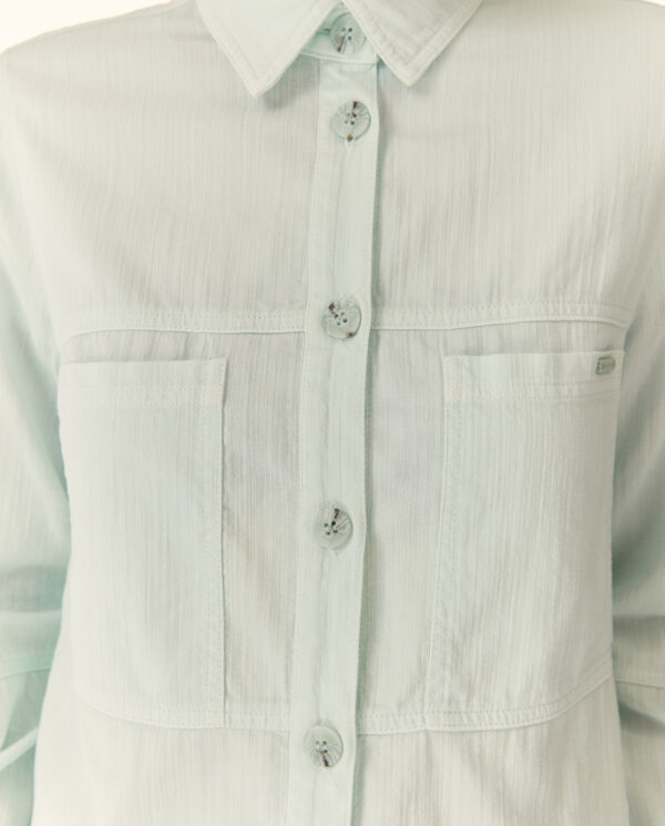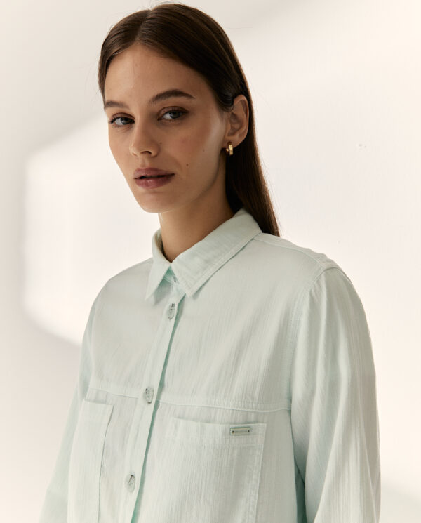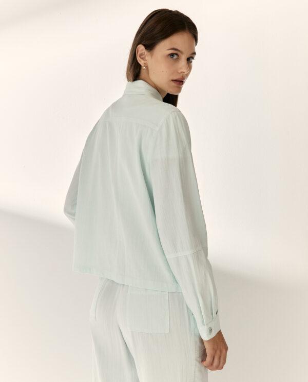 Cazadora de algodón orgánico, con cuello camisero y botones delanteros, de Paz Torras. Bolsillos de plastón en delanteros, y manga larga ligeramente abullonada.