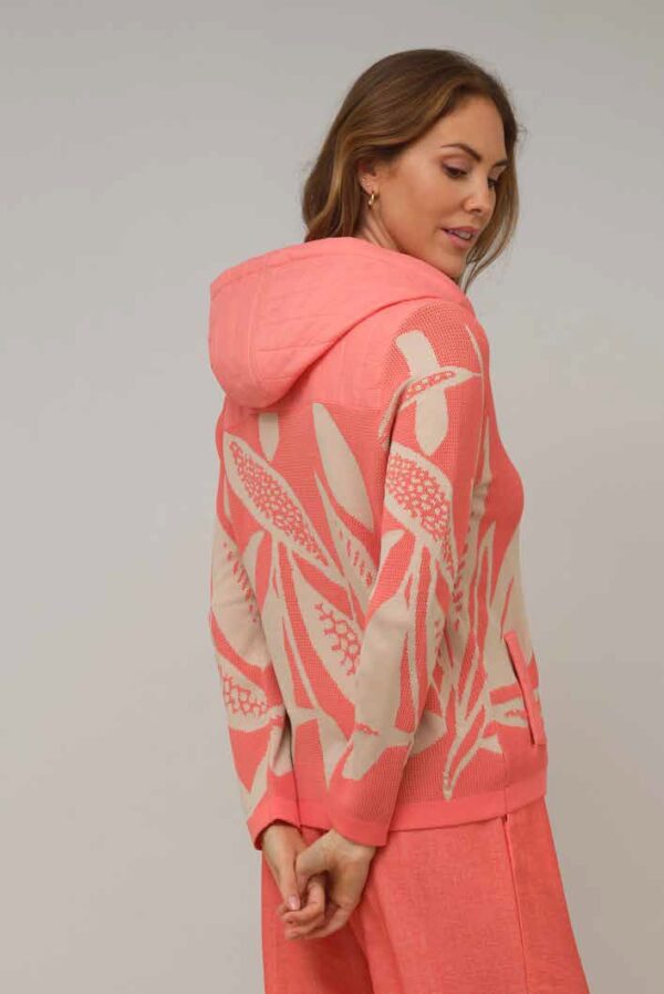 Cazadora corta combinada en tejido de punto y guata, con capucha y manga larga, de la marca Scorzzo. Estampada con dibujos asimétrico. Cerrada con cremallera y bolsillos sesgados en delanteros.