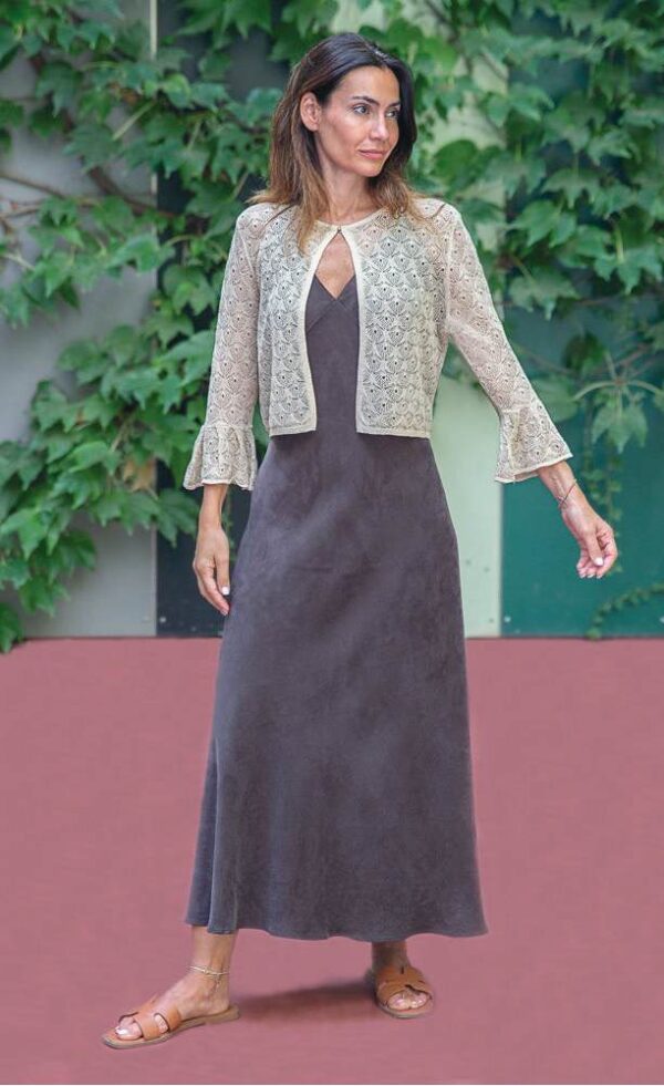Chaqueta corta, en punto de lurex calado, con cuello redondo y manga francesa, de la marca Trípode. Cerrada en cuello con un sólo broche. Volante del mismo punto en mangas.