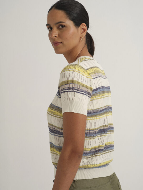 Chaqueta de punto calado, con cuello a la caja y manga corta, de la marca Azay. En rayas asimétricas difuminadas, con botones delanteros y elástico ancho en cuerpo y mangas.