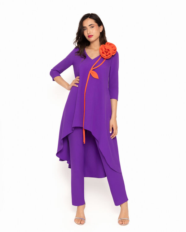 Conjunto de Fiesta, de casaca larga y pantalón recto, de Moncho Heredia. Casaca de cuello pico y manga al codo, con largo asimétrico. Adorno de flor grande en hombro. Pantalón recto.