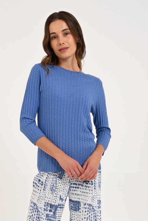 Jersey de perlé, con cuello barco y manga francesa caída, de la marca Boddyblue. En punto de relieve y de color liso.