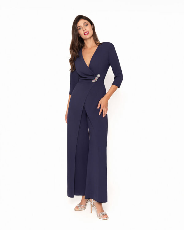 Mono de fiesta en color liso, de pata recta, y manga francesa, de Moncho Heredia. Escote a pico cruzado, y recogido a la cintura con broche. Efecto doble capa en pantalón.