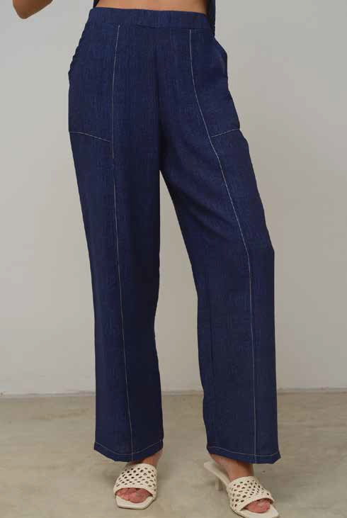 Pantalón de pata recta y cintura elástica, en tejido de algodón denim, de la marca Scorzzo. Bolsillos sesgados grandes, pespunteados al contraste.