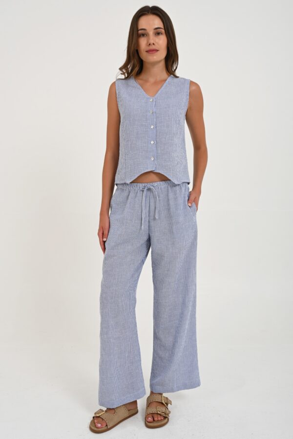 Pantalón de tejido fluido mil rayas, con pata ancha, tobillero, de la marca Boddyblue. Cinturilla elástica con cordón y bolsillos sesgados delanteros.
