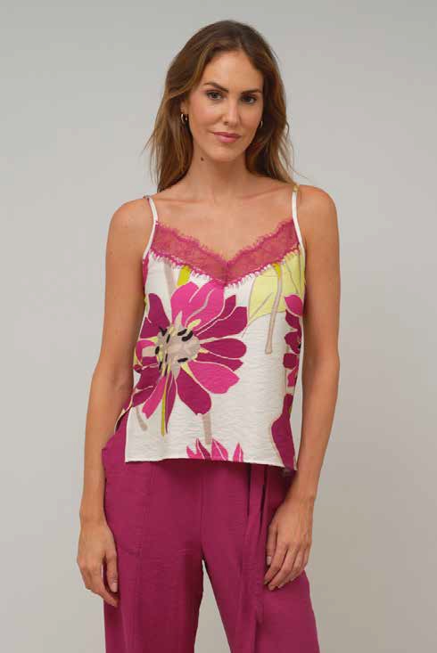 Top lencero, en tejido fluido estampado en flores grandes, de la marca Sorzzo. Escote a pico con encaje. Abertura lateral en bajo.