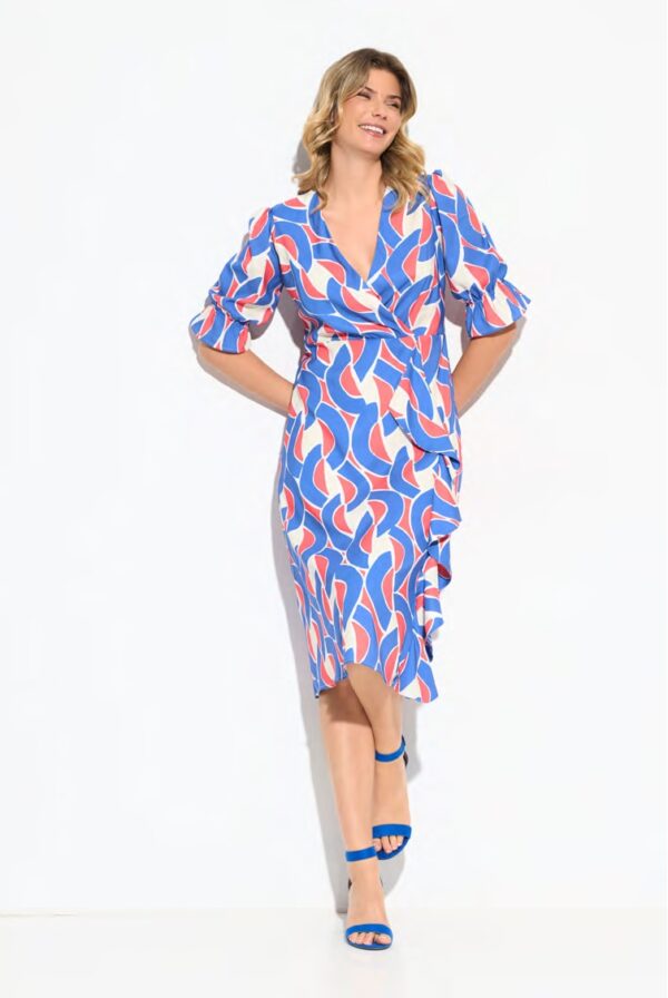 Vestido midi, estampado con motivos geométricos en tonos azules, de la marca Chevió. Manga francesa abullonada al codo, escote a pico cruzado y falda abierta con volante en cascada.