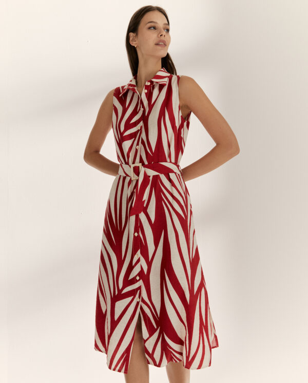 Vestido camisero estampado, en largo midi, de Paz Torras. Sin mangas y con cinturón al tono.