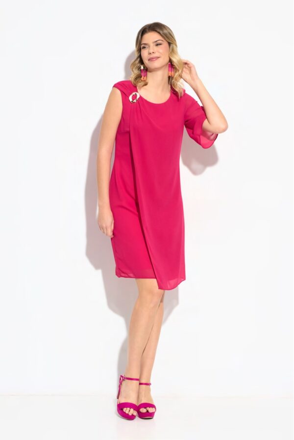 Vestido corto de vestir, de color liso en tejido tipo gasa, de la marca Chevió. De doble capa, efecto envolvente, manga irregular, y escote redondo drapeado en un lado con broche.