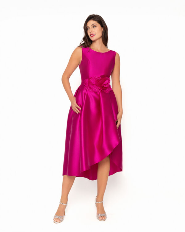Vestido de cóctel, en tejido mikado, con tirante ancho y escote barco, de Moncho Heredia.Cuerpo entallado con costadillos y falda de vuelo con efecto envolvente y largo irregular. Aplique de flor grande al tono en cintura.