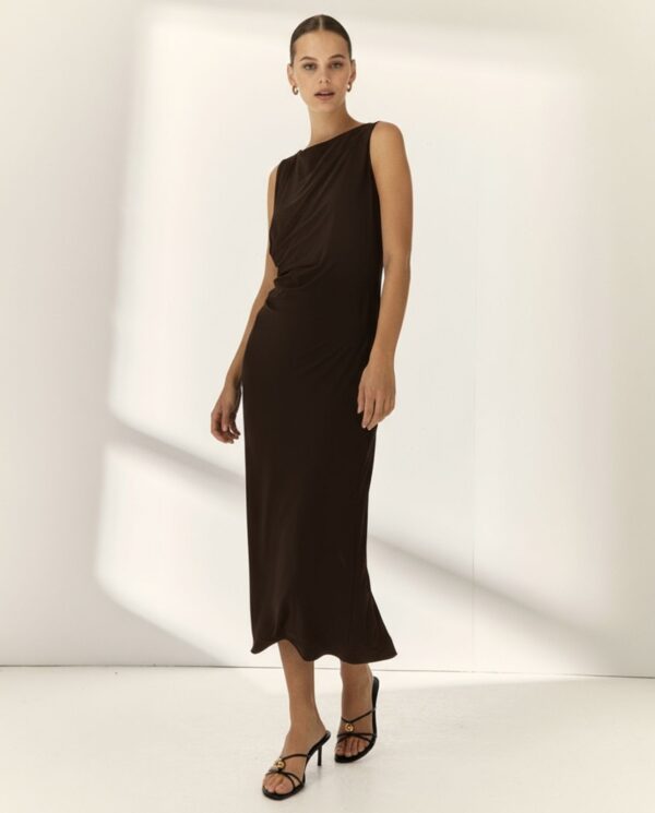 Vestido negro, en largo midi, recto y entallado, con cuello barco y sin manga, de Paz Torras. Cuerpo drapeado a la cintura en un lado.